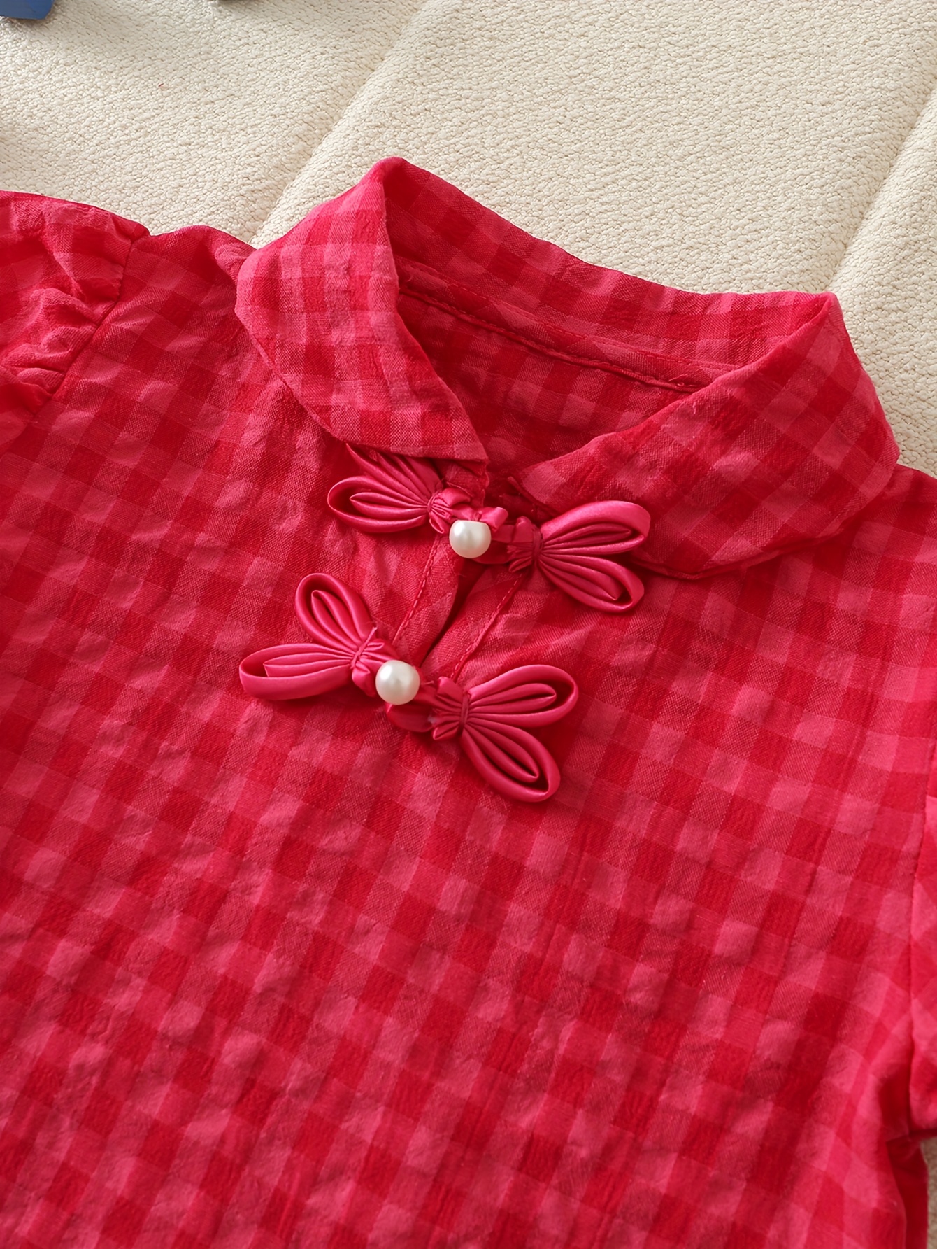 2pcs Korean Style Red Grid Half Sleeve Skirt Set for Youngsters Girls