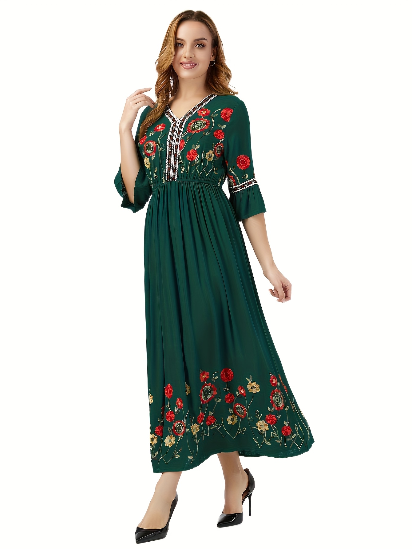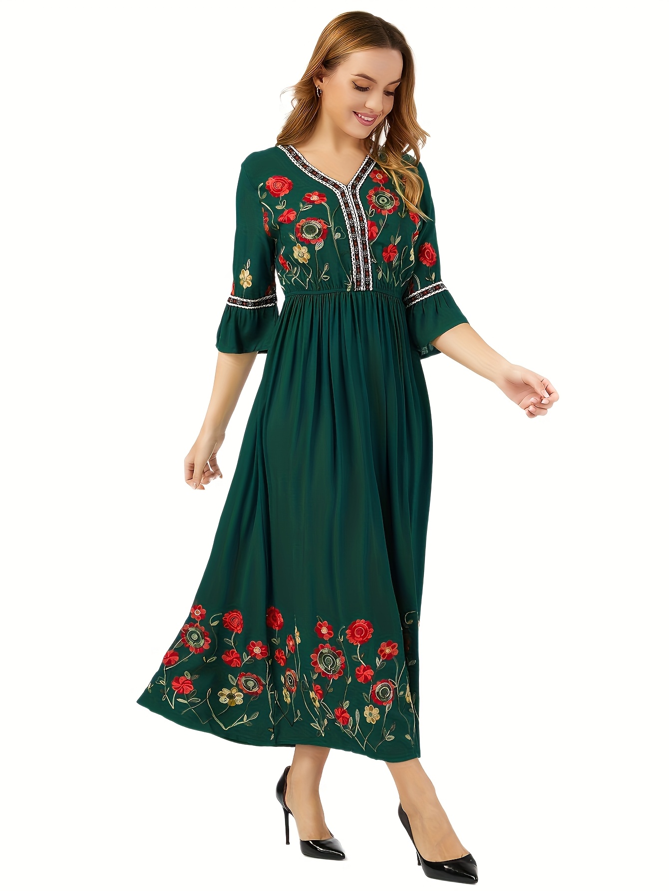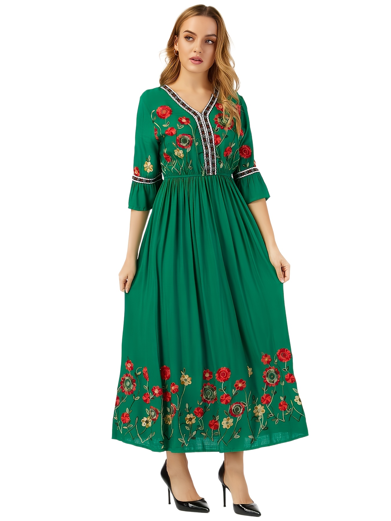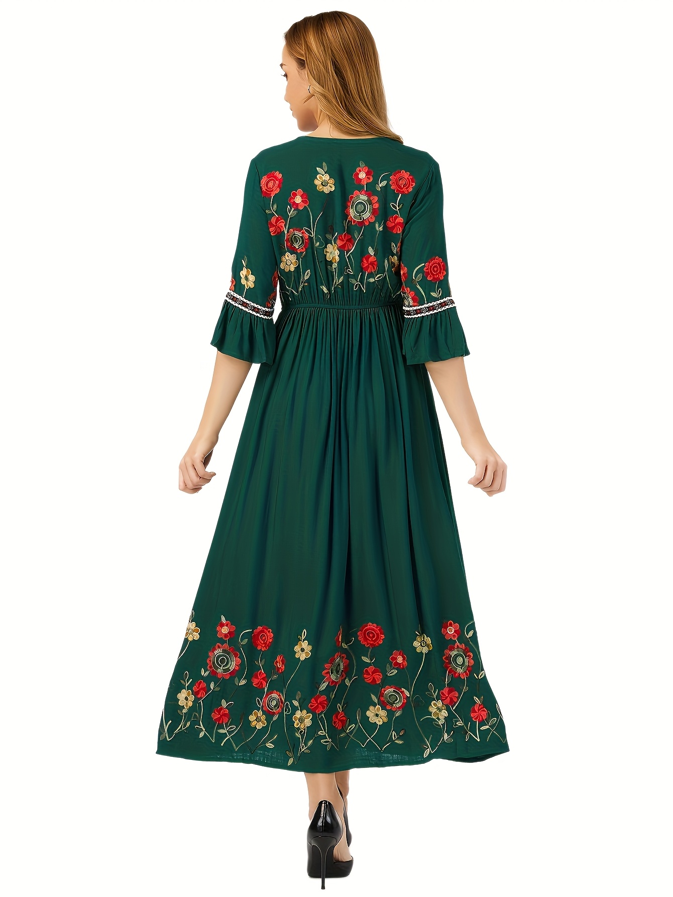 Elegant Green Embroidered Maxi Dress with V-Neck and Ruffle Sleeves