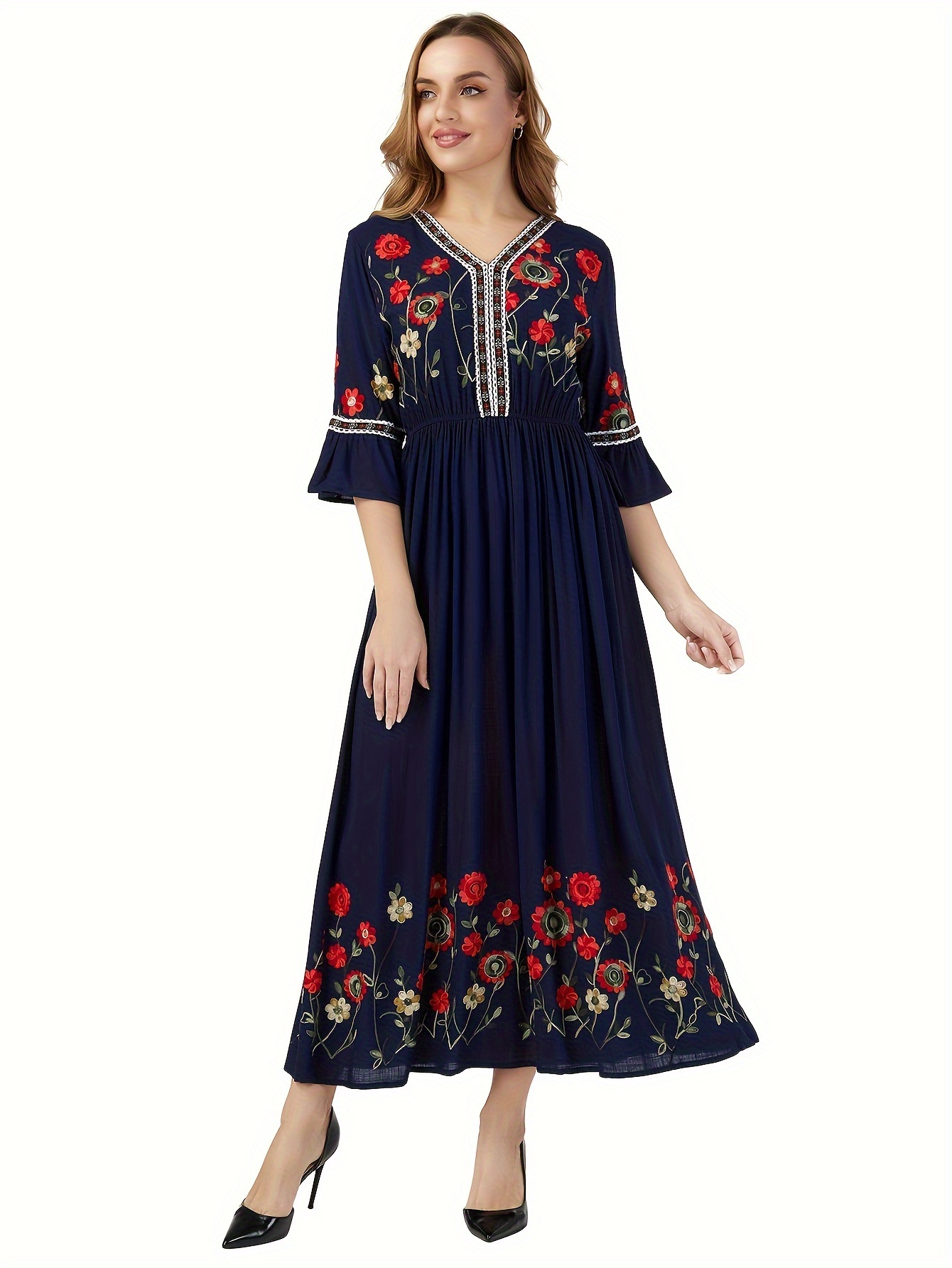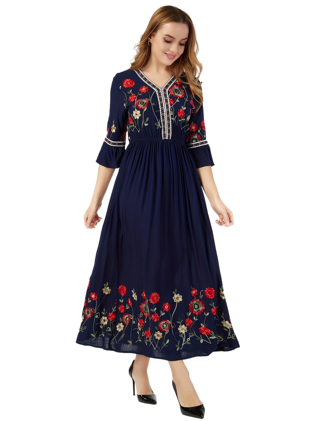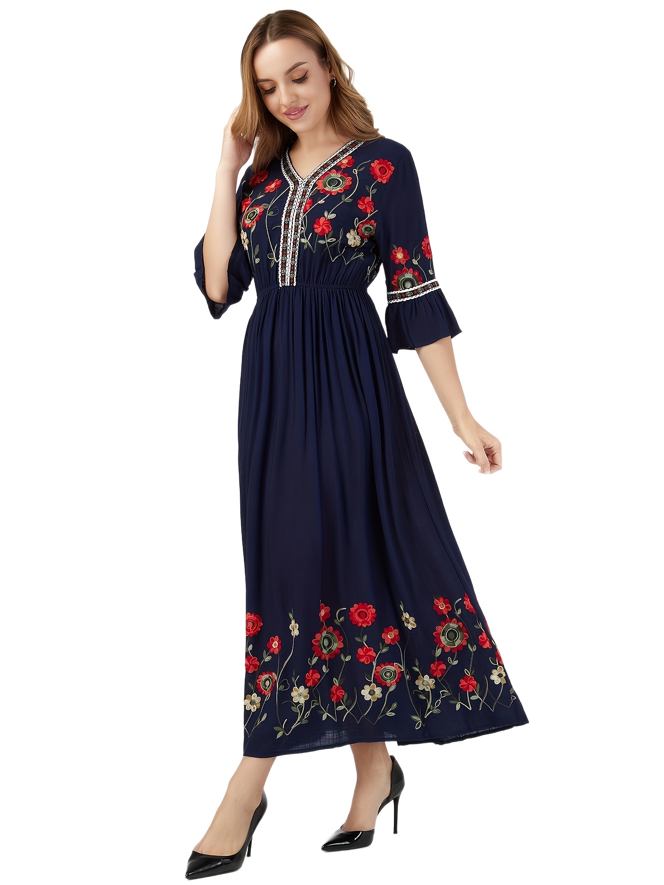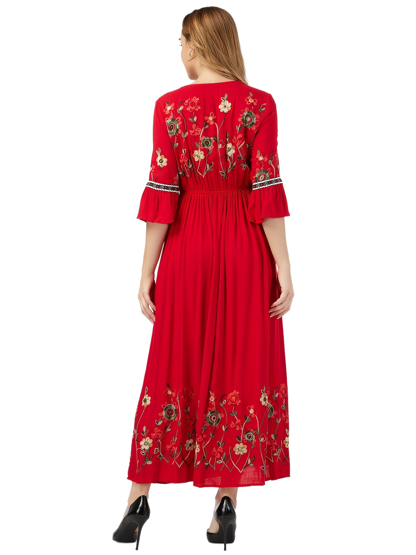 Elegant Green Embroidered Maxi Dress with V-Neck and Ruffle Sleeves