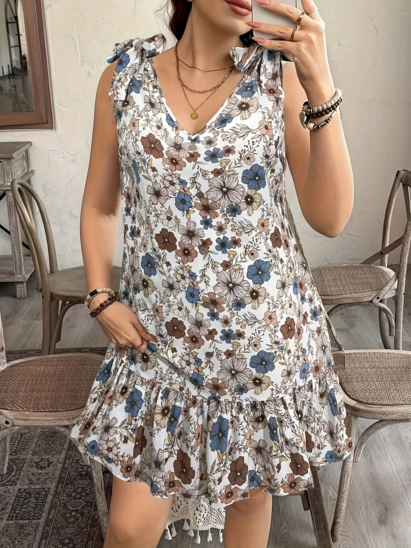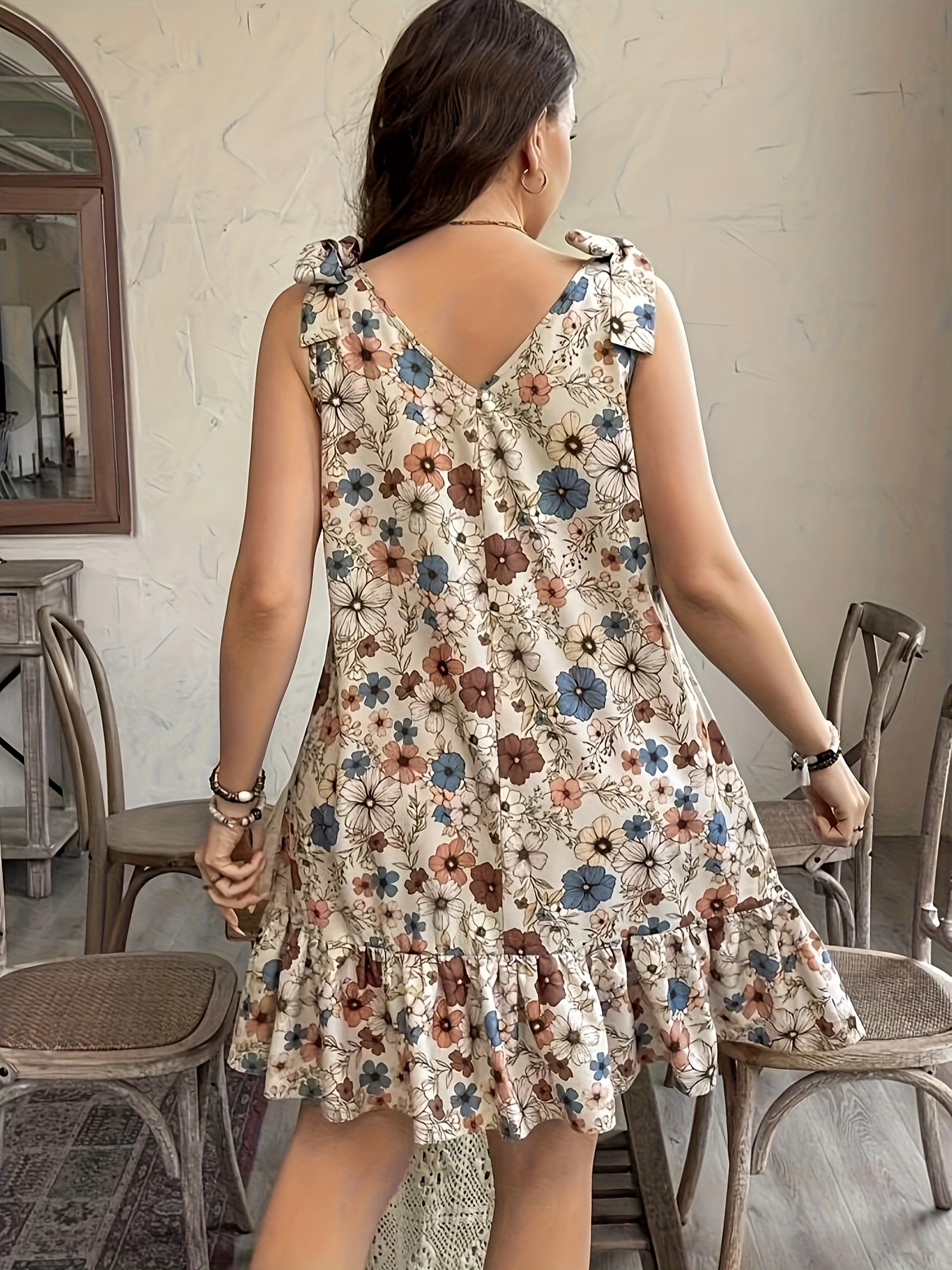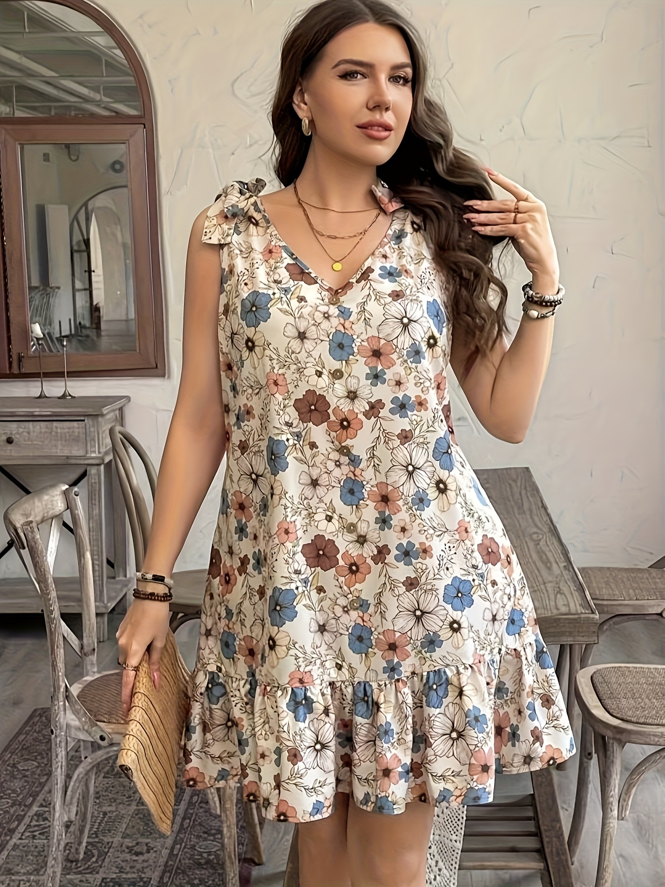 Floral V-Neck Sleeveless Light Weight Dress with Ruffled Hem & Button Details