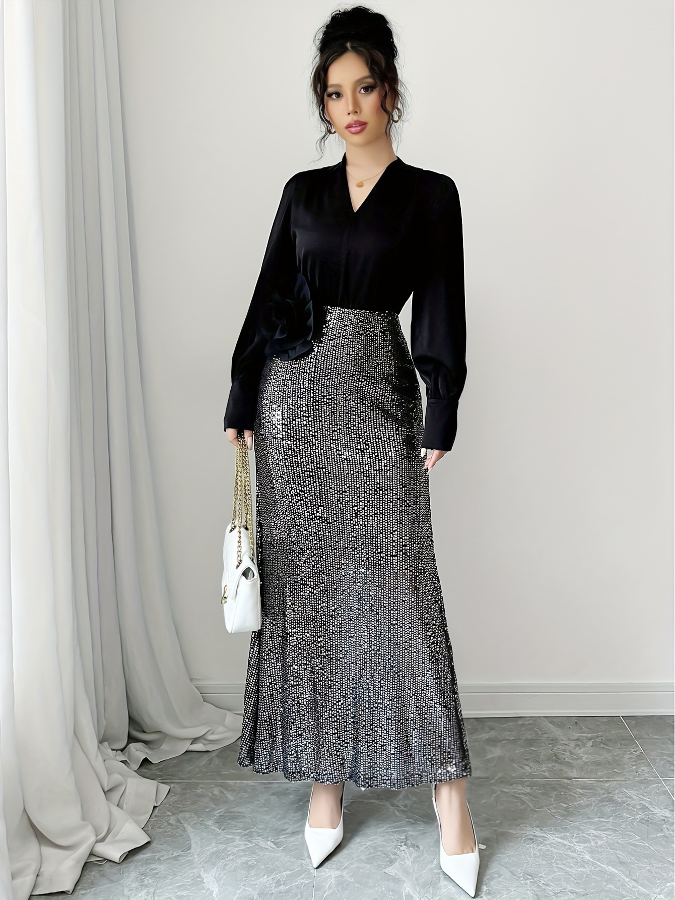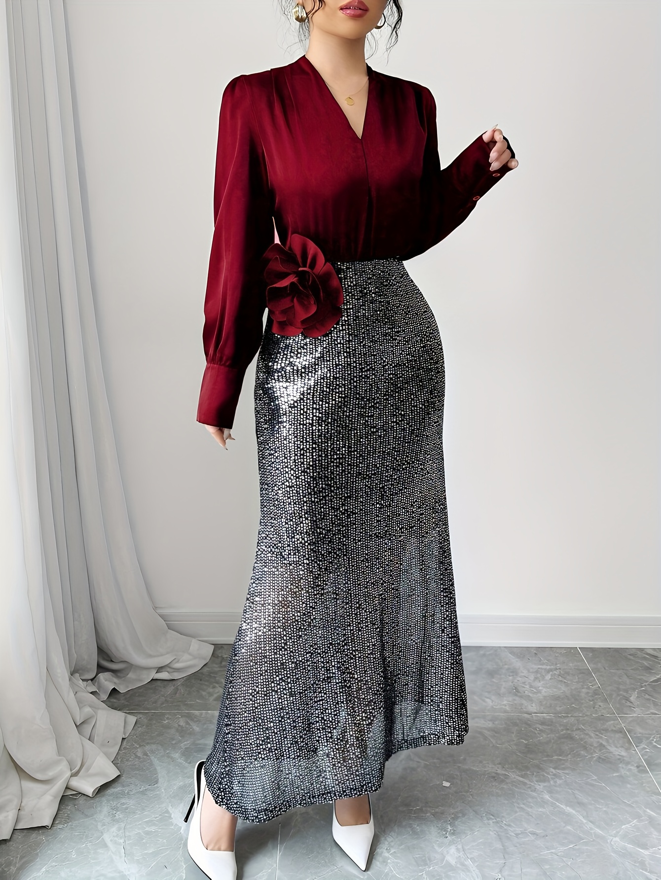 French Elegant V-Neck Sequin 3D Rose Dress - Sparkling Long Sleeve A-Line Evening Gown