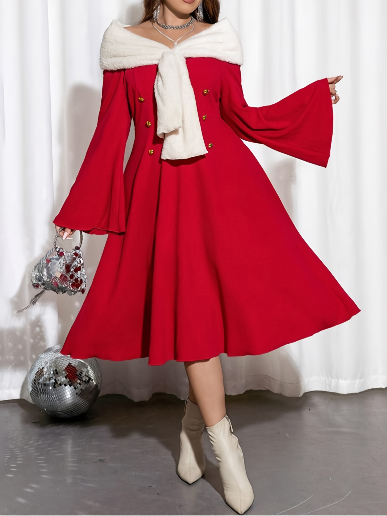 Plus Size Elegant Off-Shoulder Long Sleeve Flared Dress for Christmas New Year Party Dress