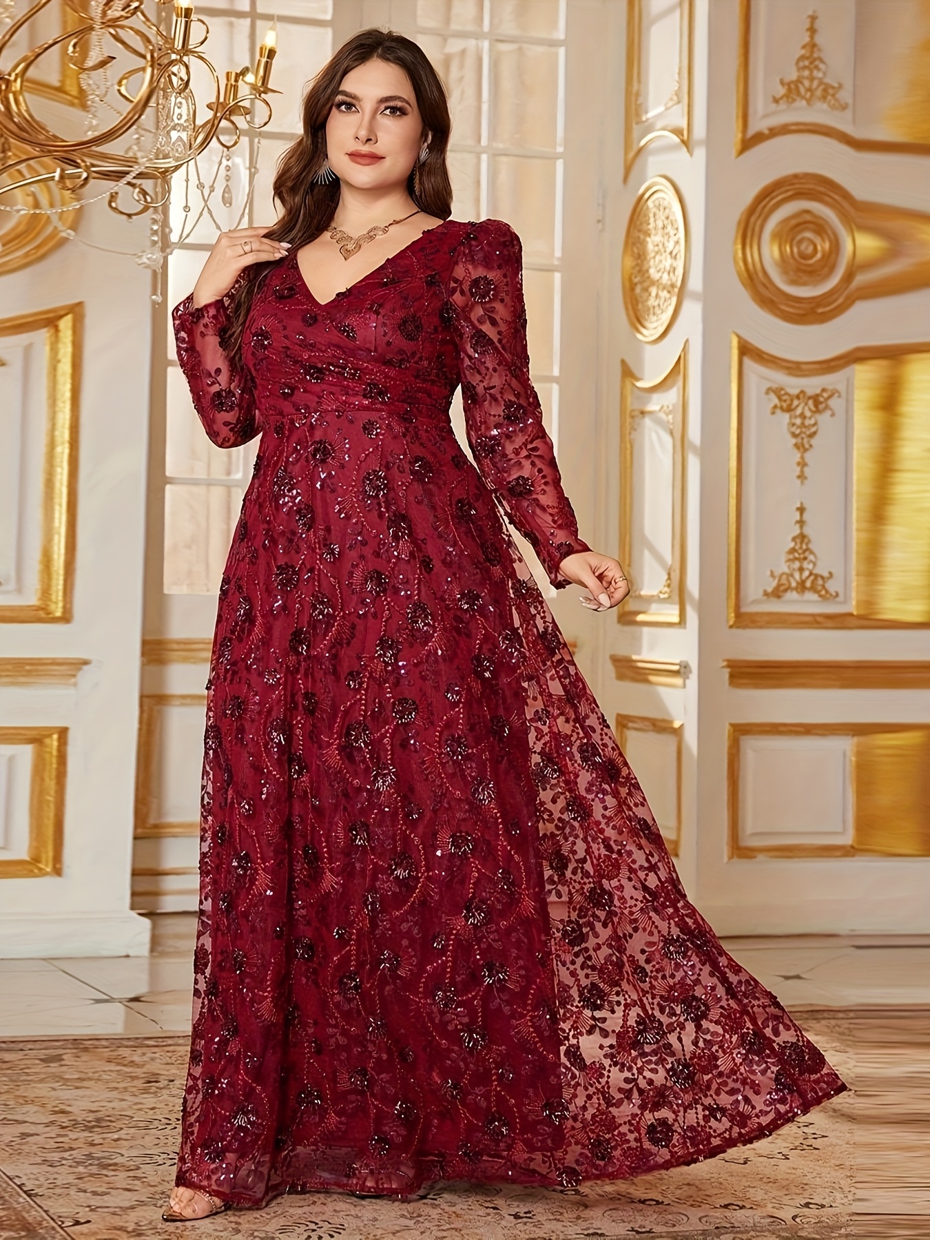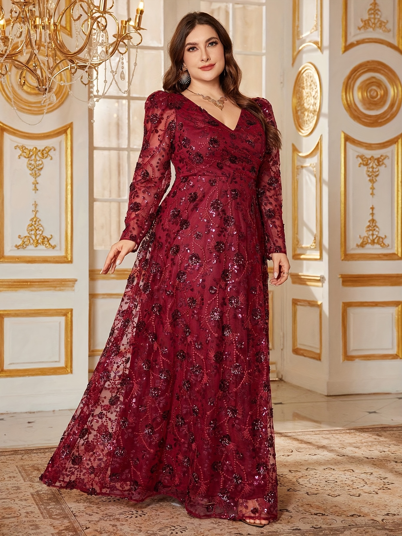 Plus Size, Elegant V-Neck Sequin Embellished Mermaid Evening Gown with Long Lampshade Sleeves