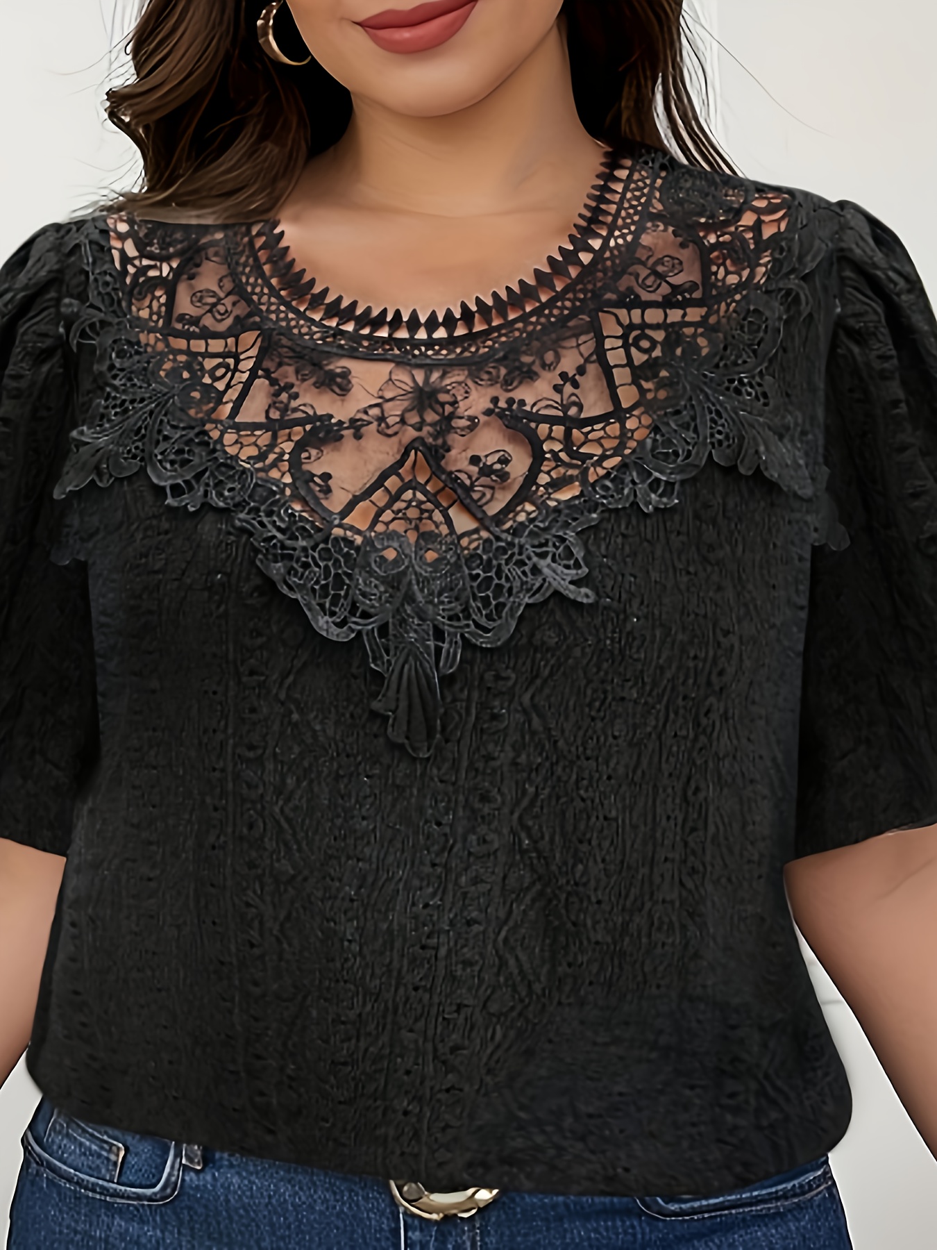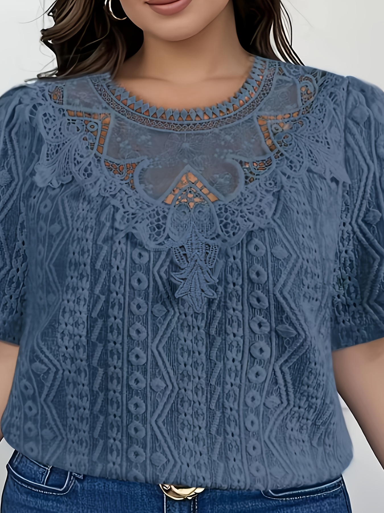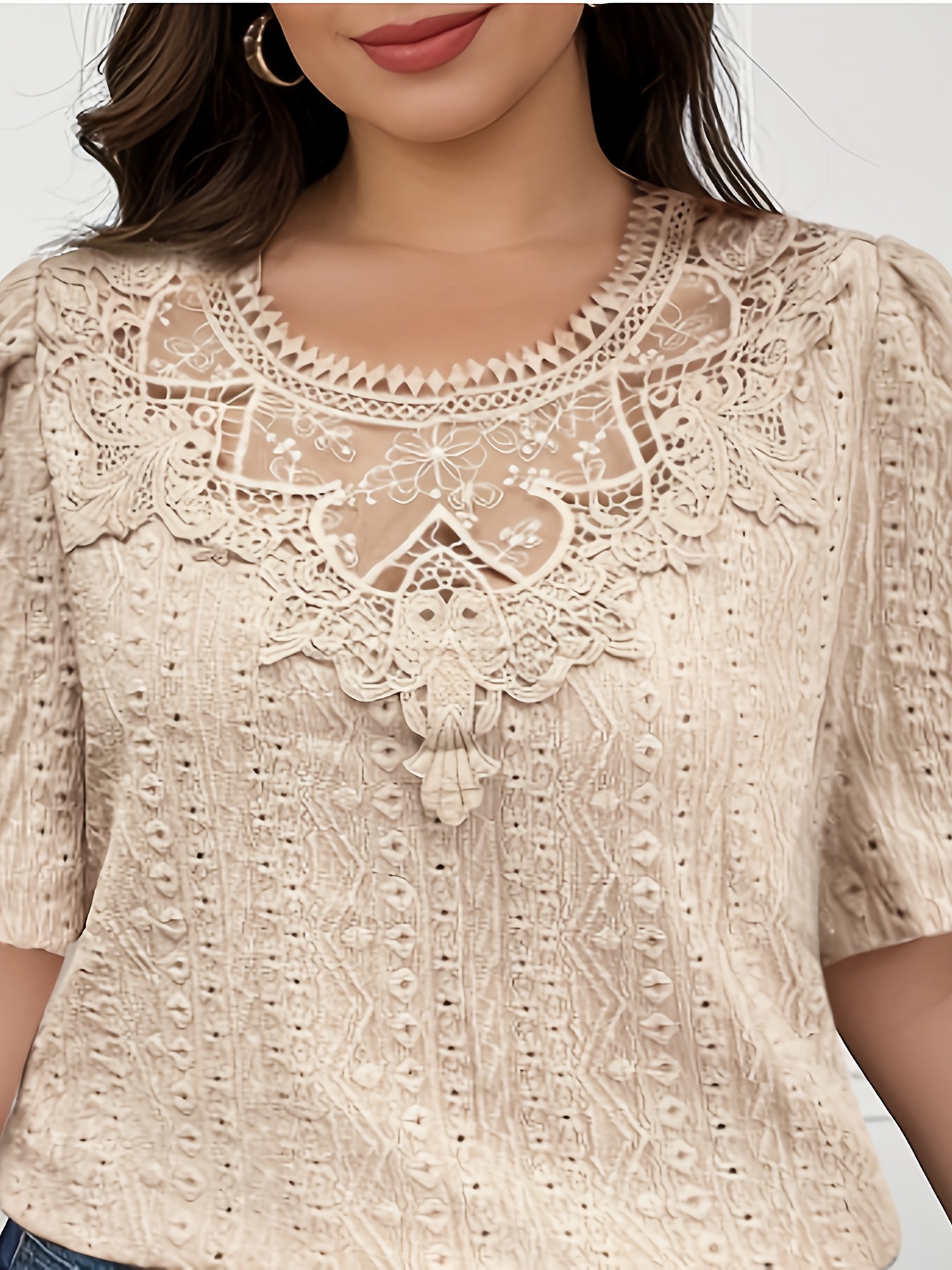 French-Inspired Floral Embroidery Lace Trim Short Sleeve Blouse