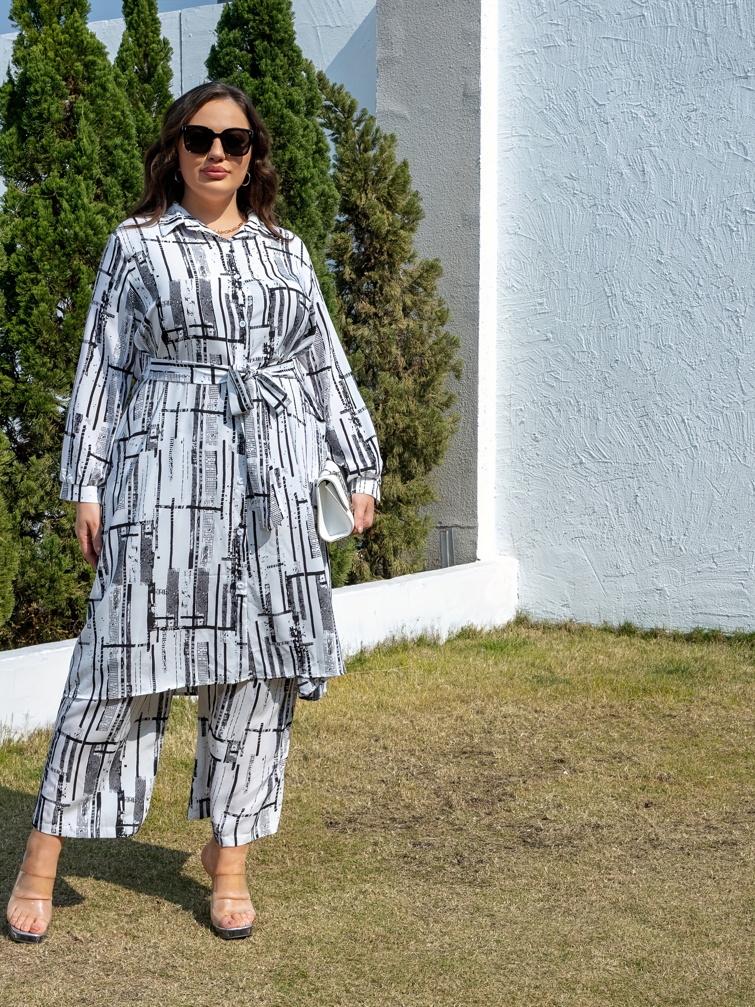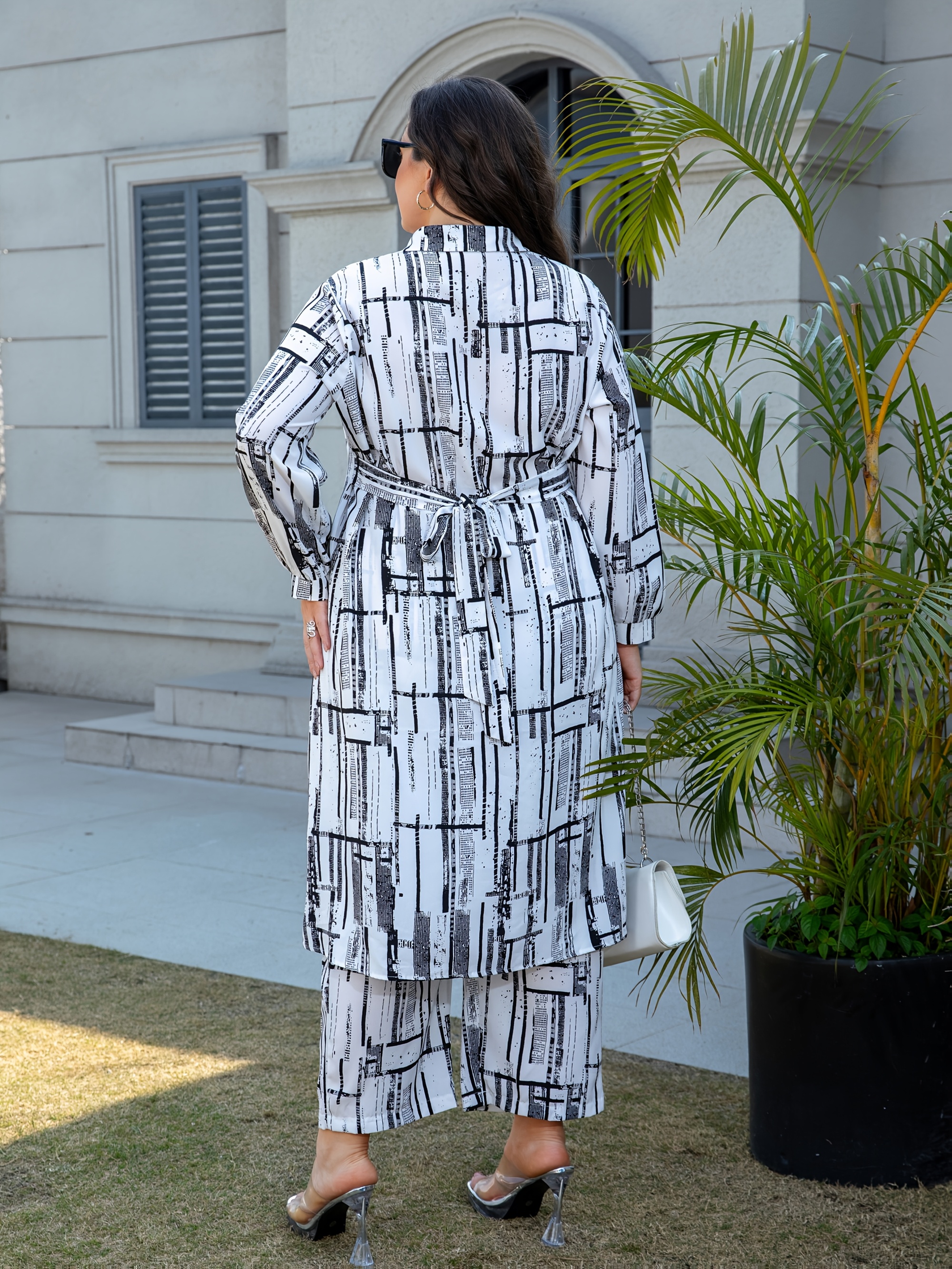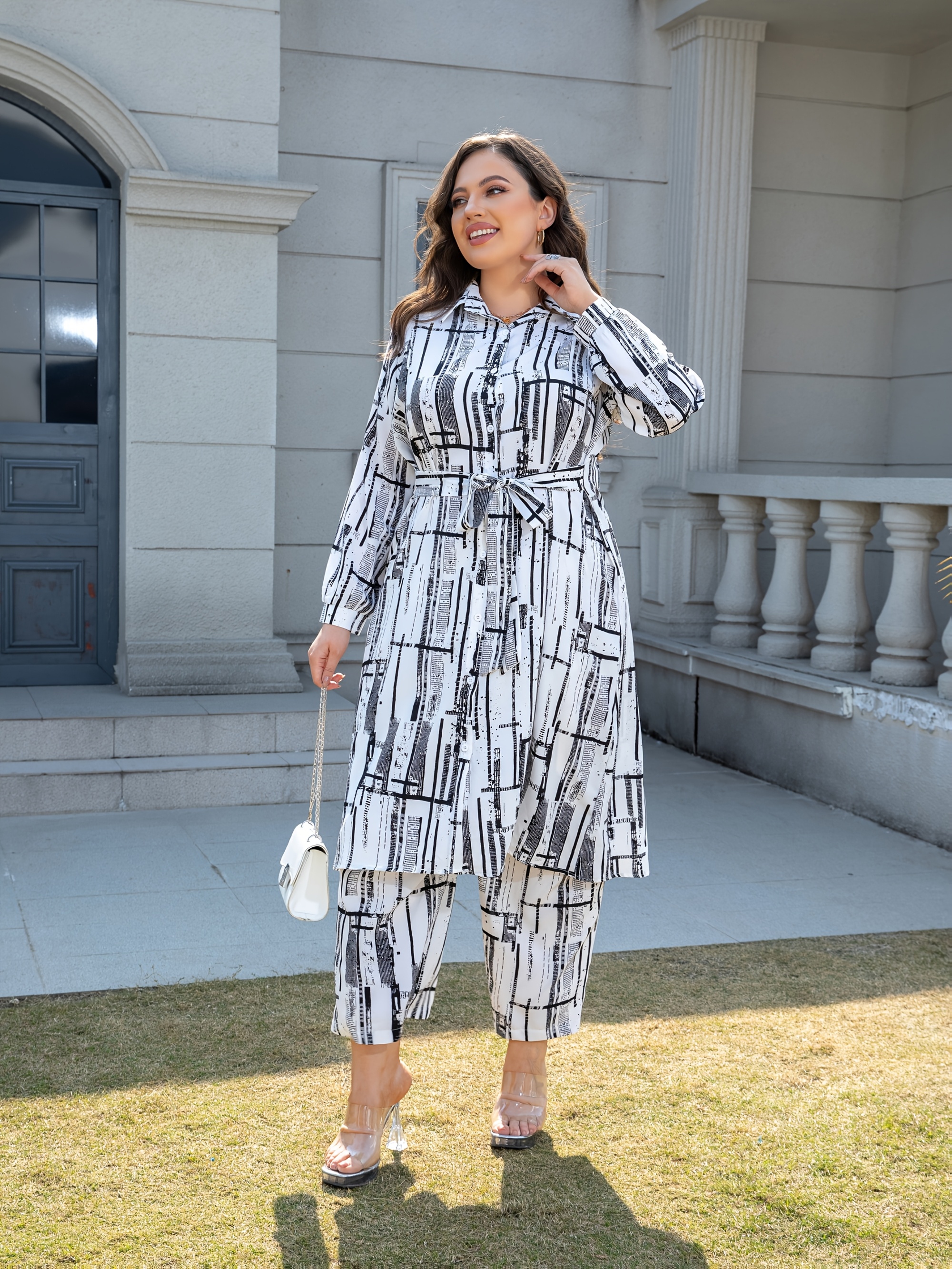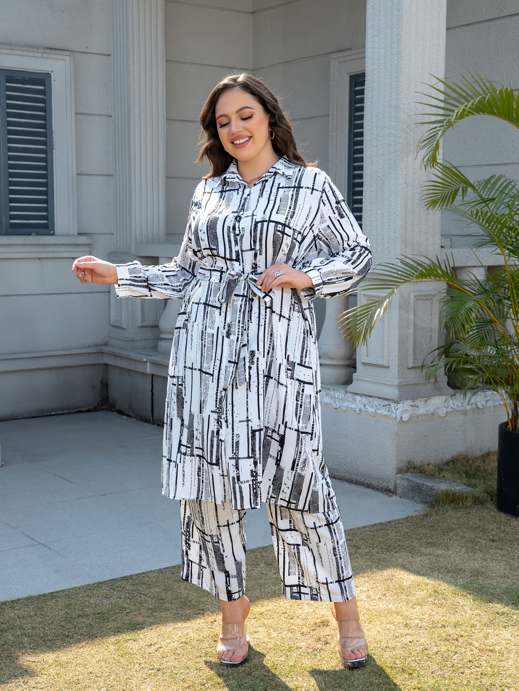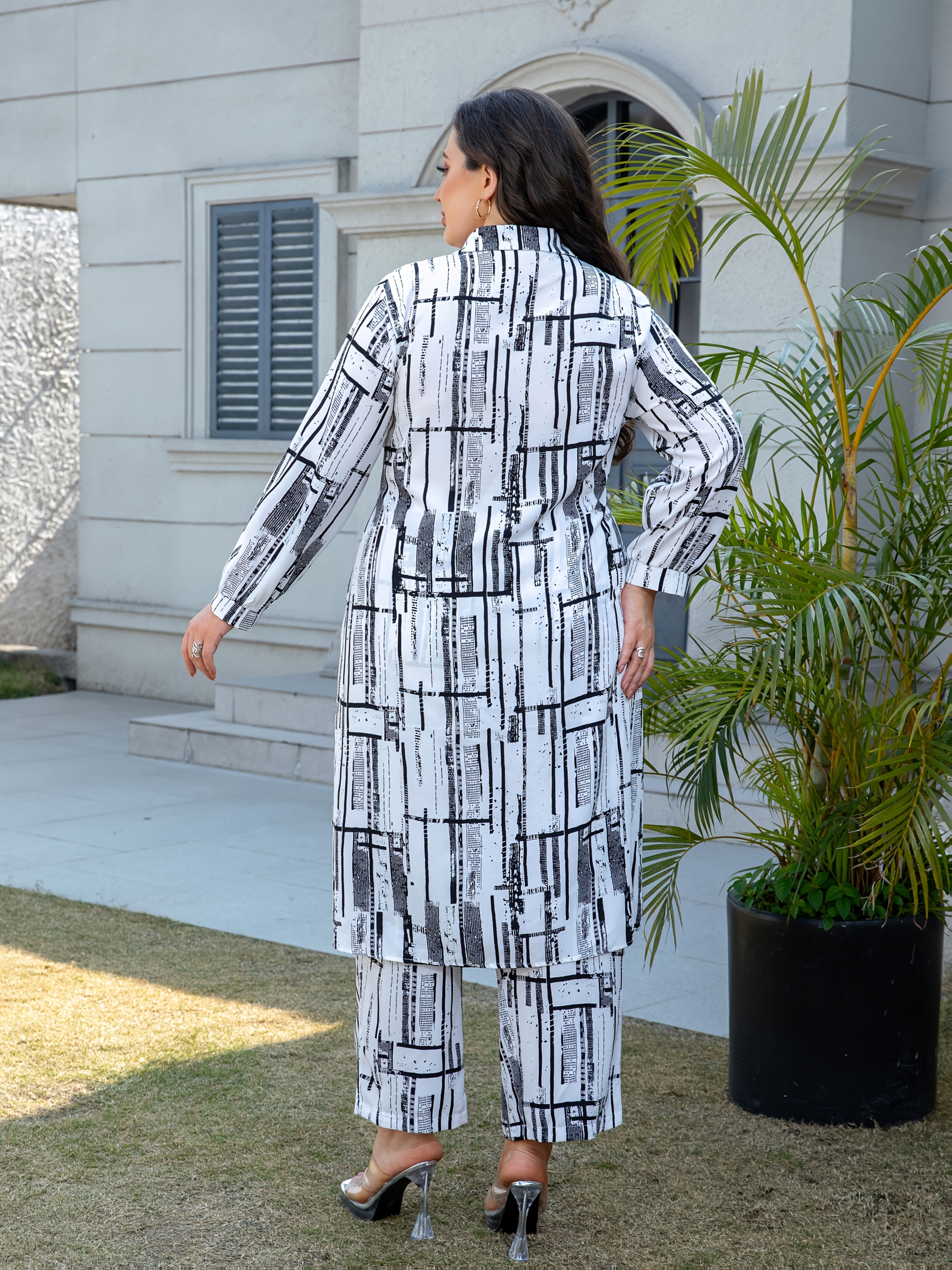 Plus Size Long Sleeve Shirt and Pants Set with Floral Print