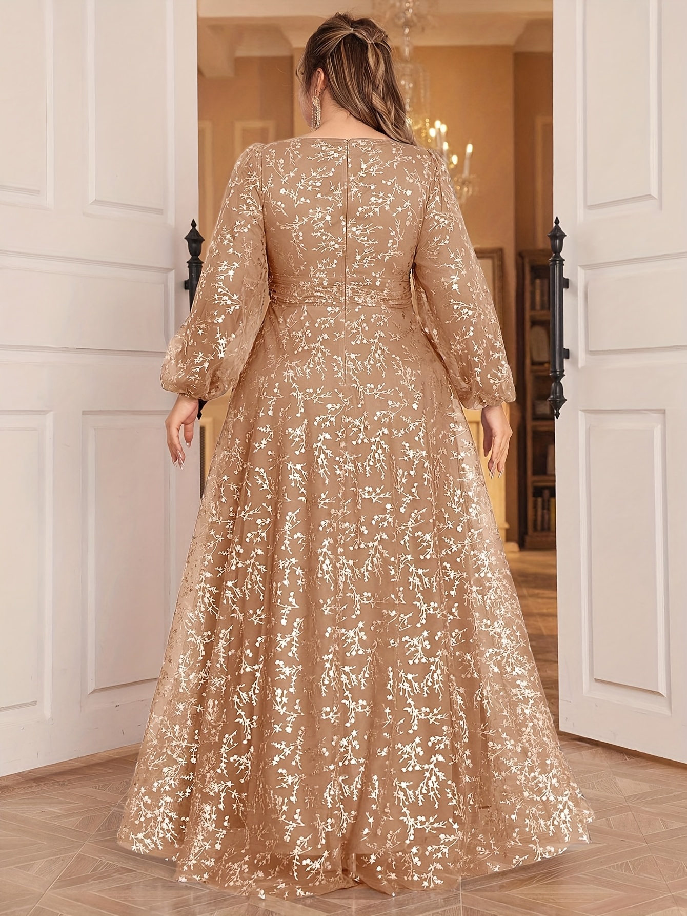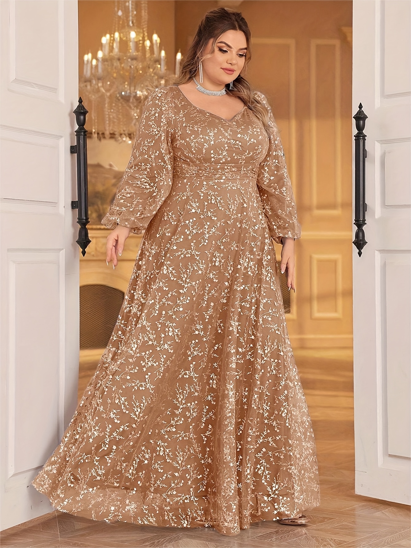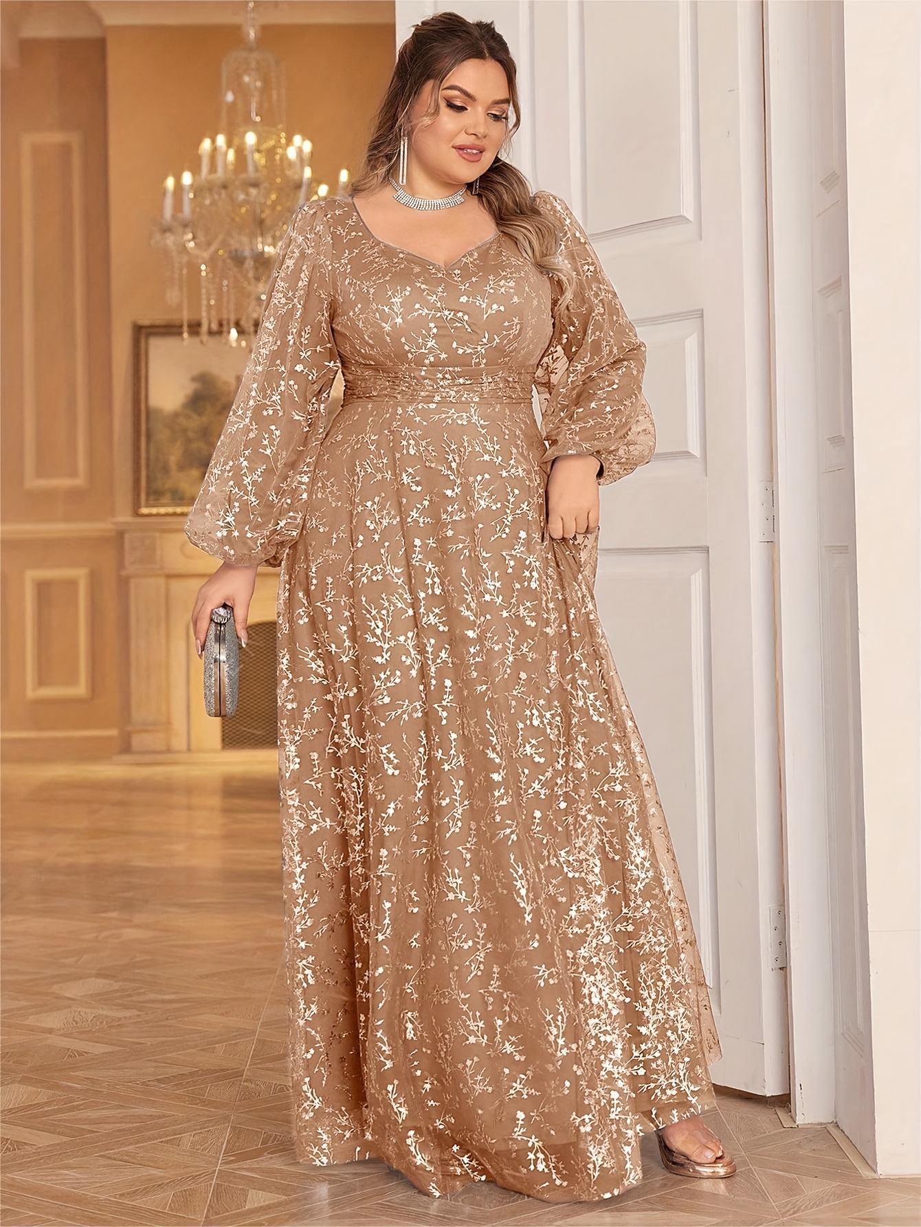 Plus Size, Plus Size Women's Golden Foil Floral Mesh Sweetheart Neck Lantern Sleeve