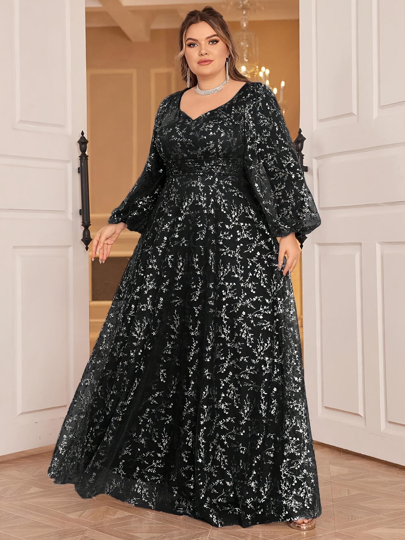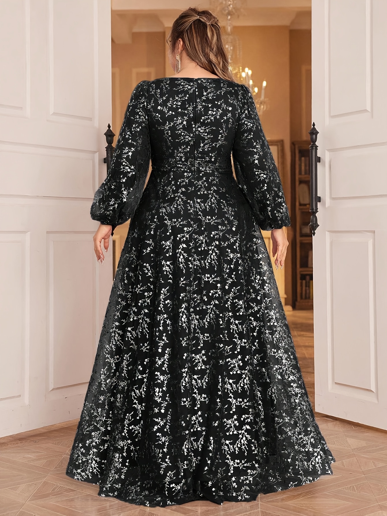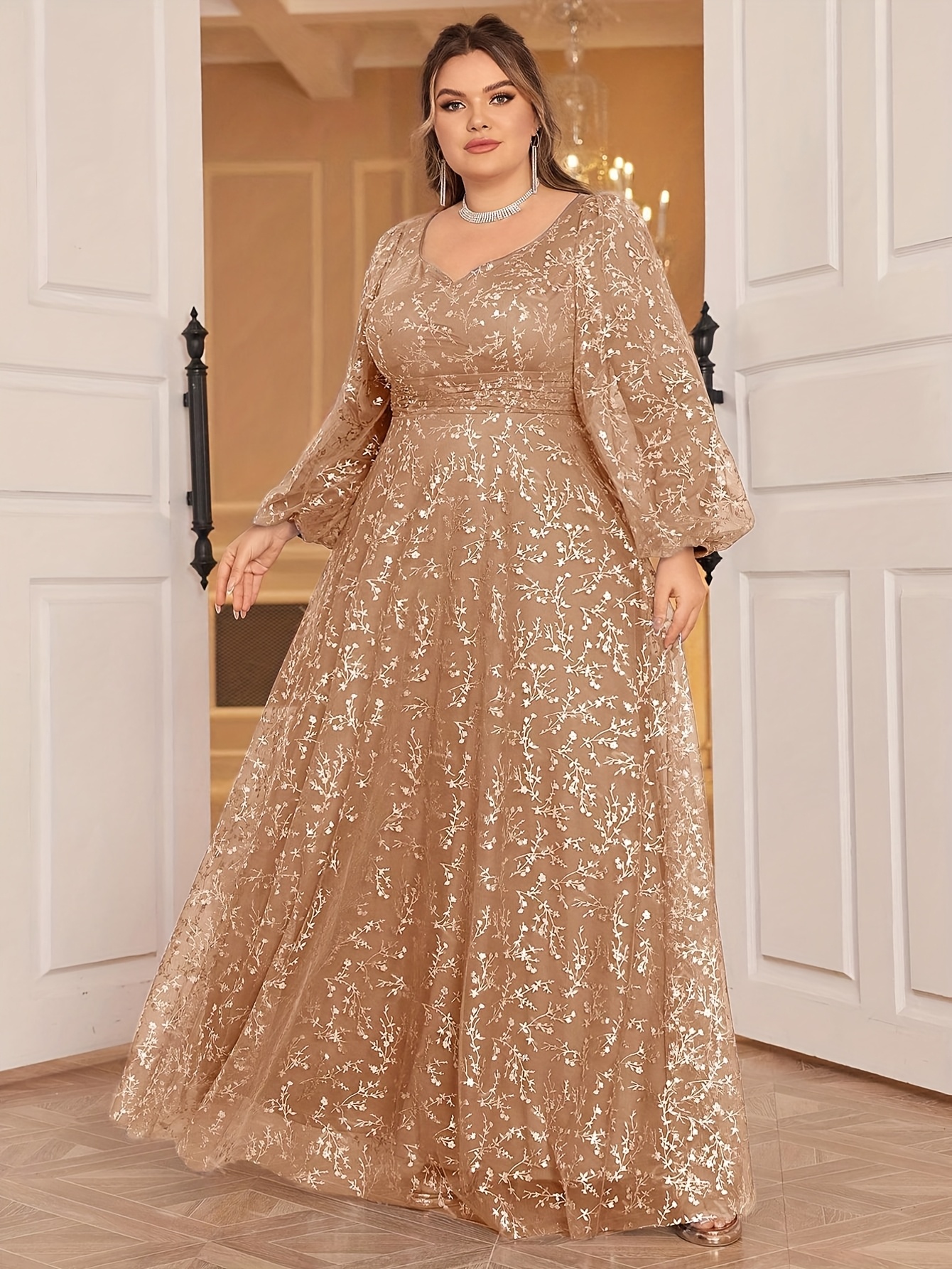 Plus Size, Plus Size Women's Golden Foil Floral Mesh Sweetheart Neck Lantern Sleeve