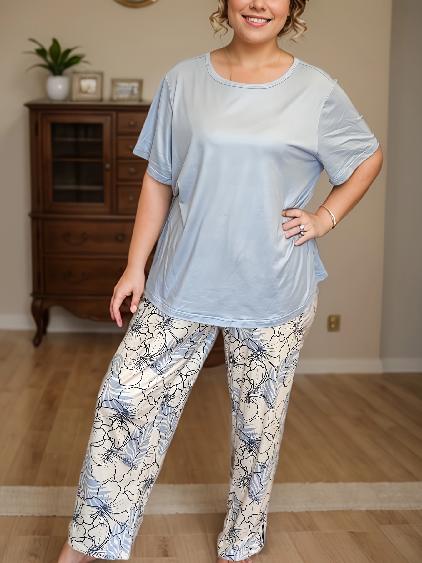 Plus Size Women's Blue Floral Print Pajama Set