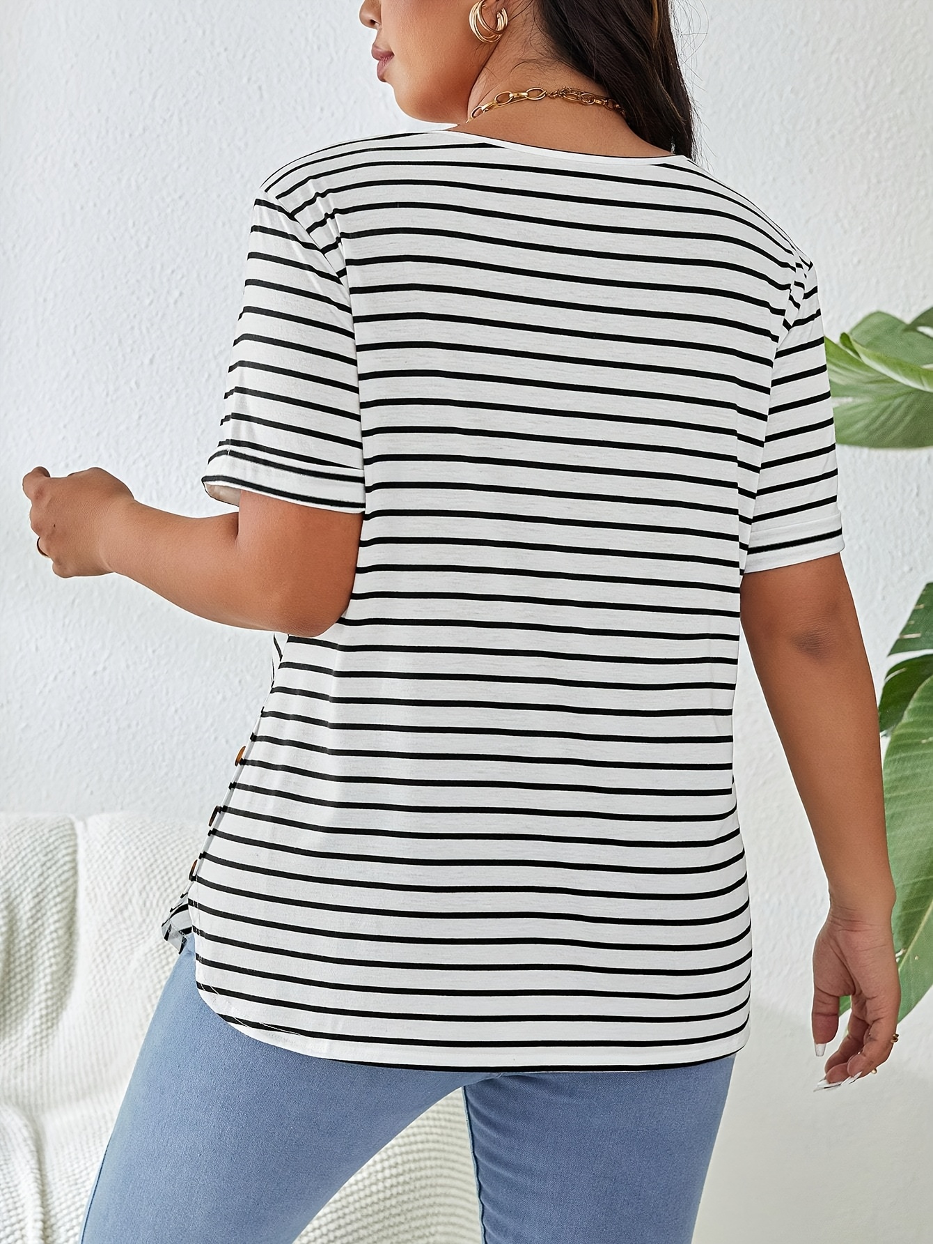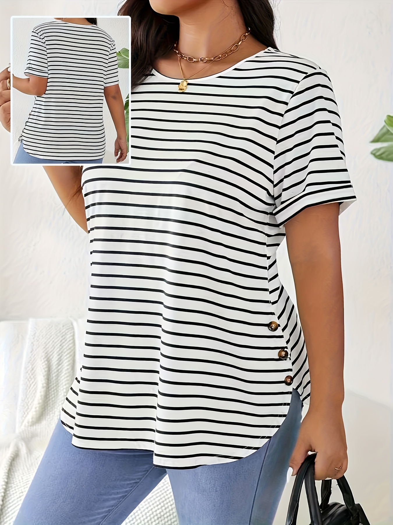 Plus Size Women's Elegant Striped Round Neck T-Shirt - Black & White Horizontal Stripes, Medium Stretch, Button Detail, Spring Summer Fall