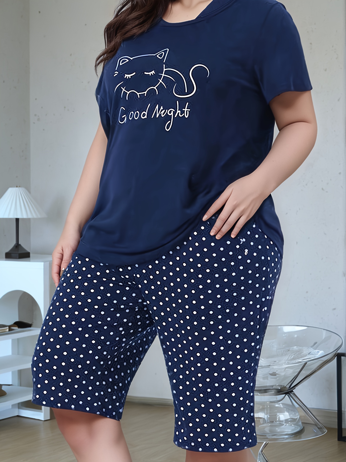 Summer Plus Size Women'S Casual Fashion Pajamas, Kitten Print, Comfortable Short Sleeve Shorts Set