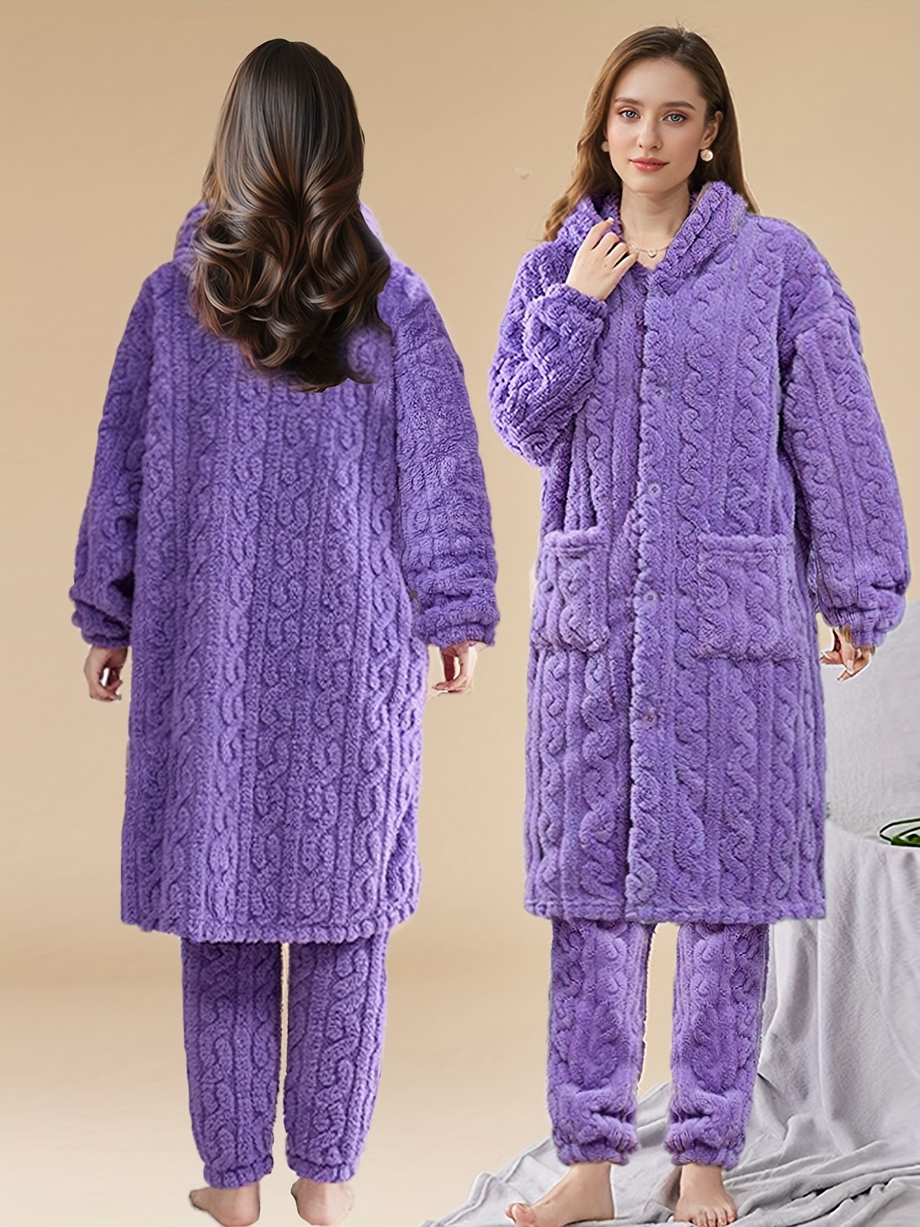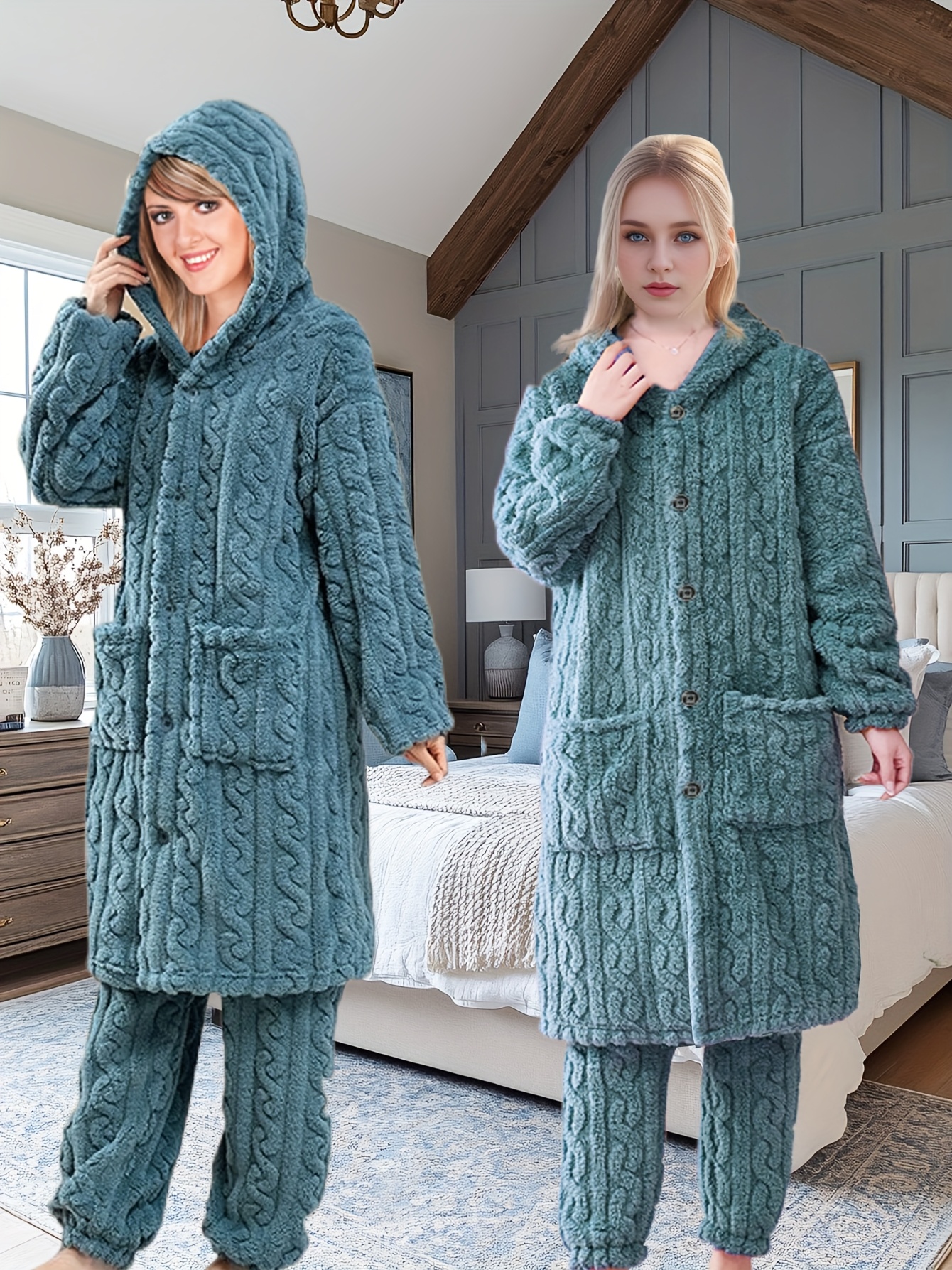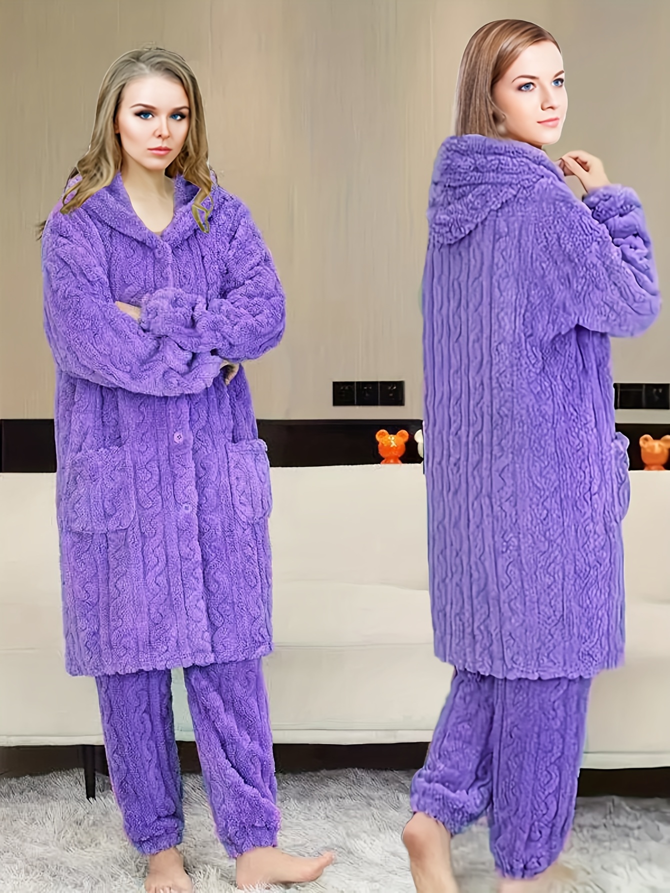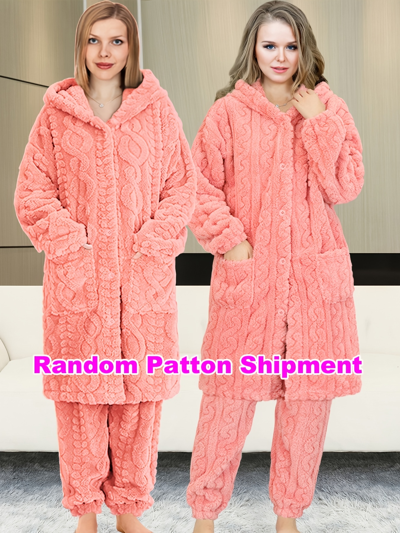 Thick Flannel Pajama Set for Women & Men - Winter Hooded Thermal Sleepwear with Front Button Placket