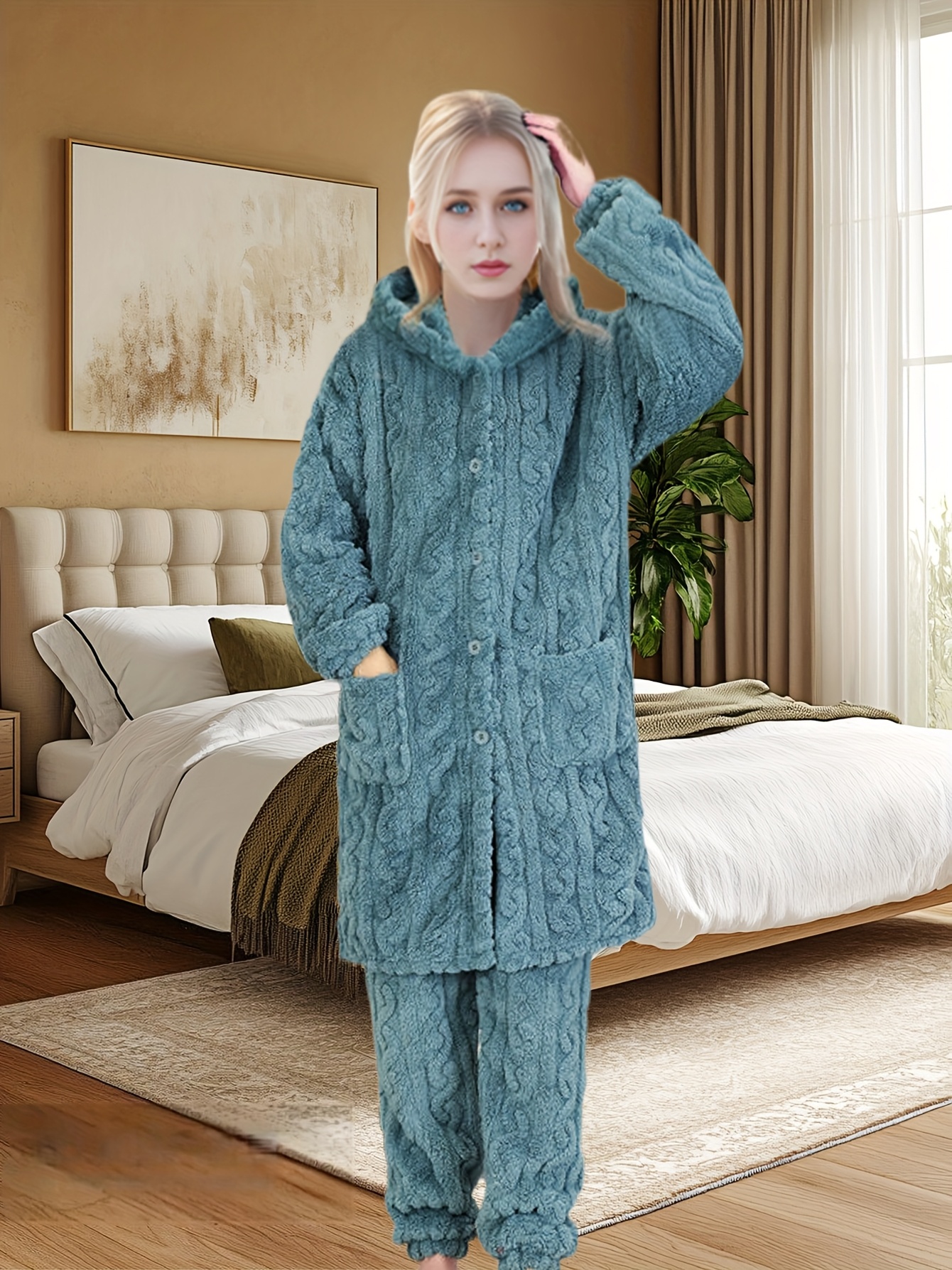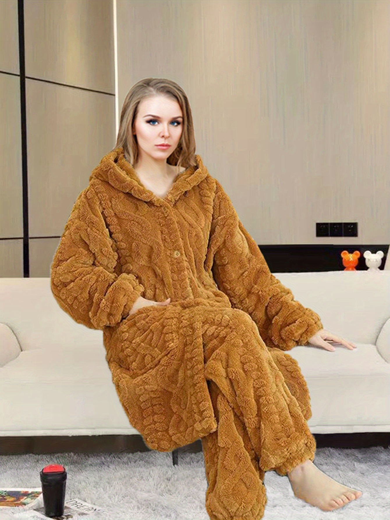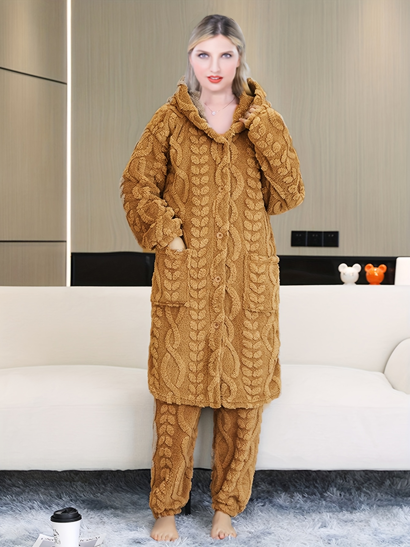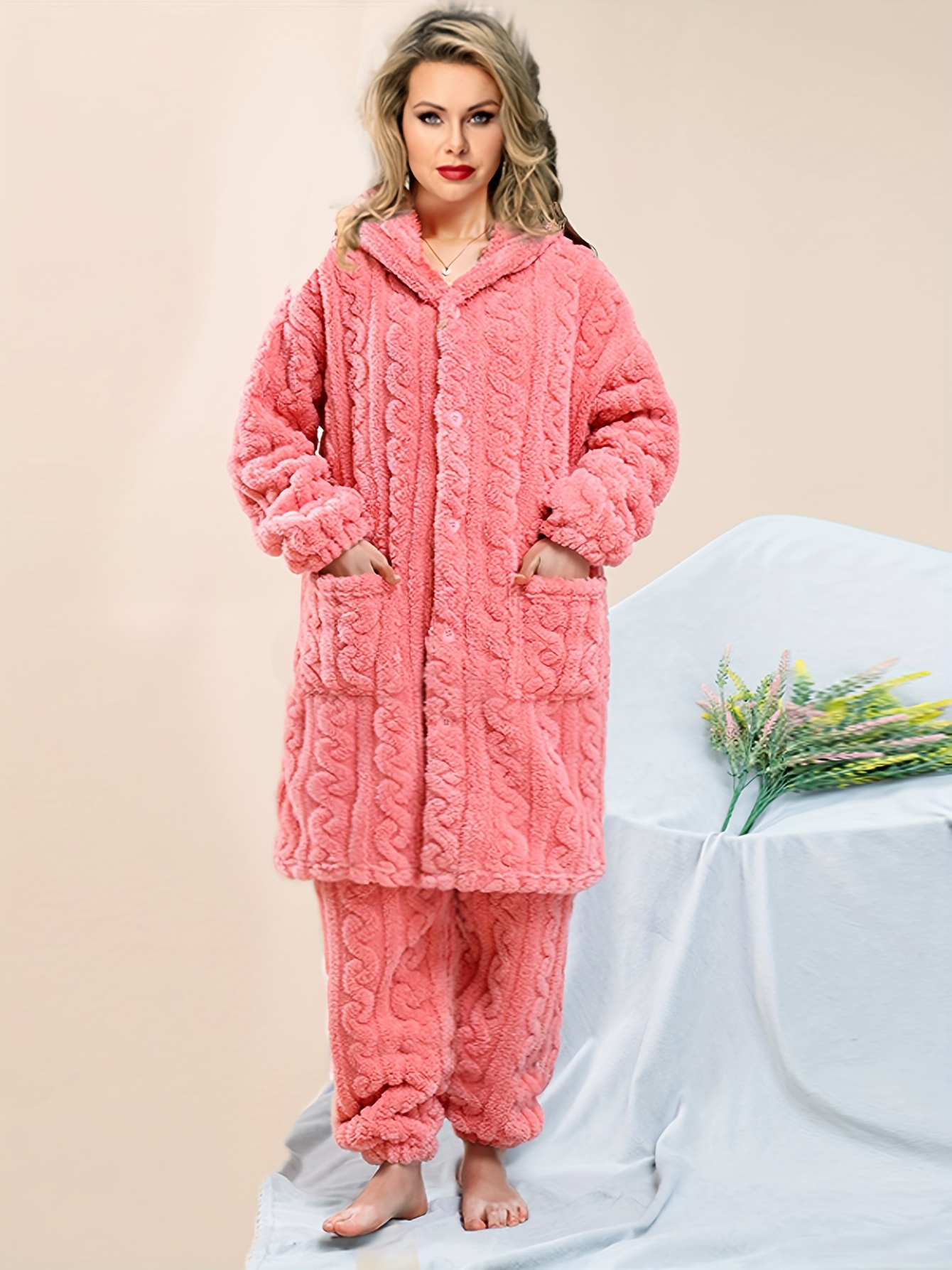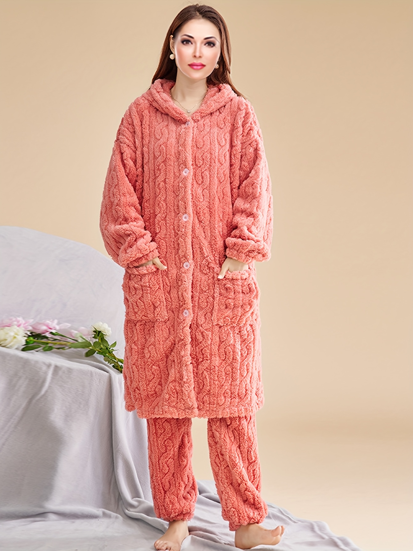Thick Flannel Pajama Set for Women & Men - Winter Hooded Thermal Sleepwear with Front Button Placket