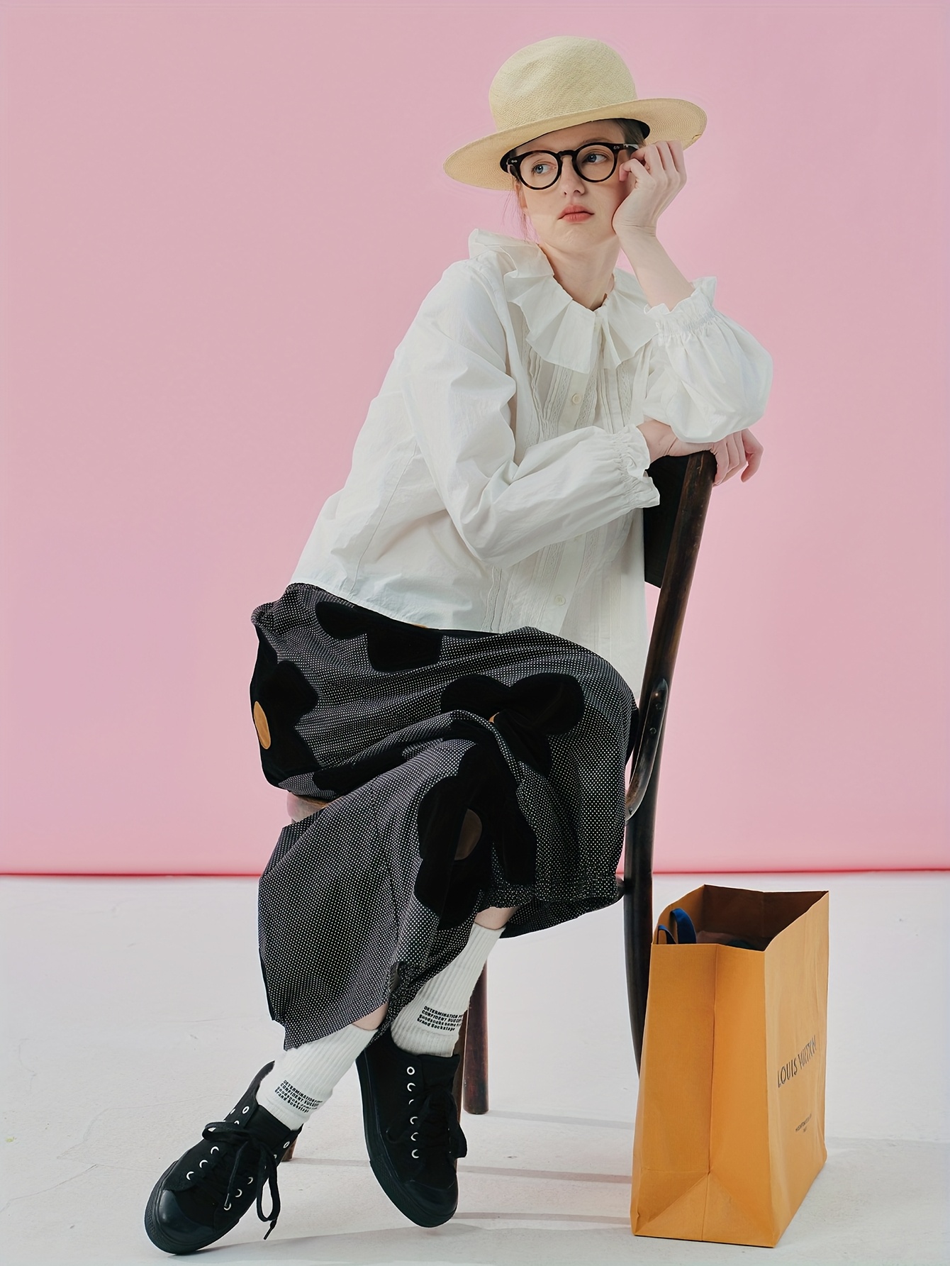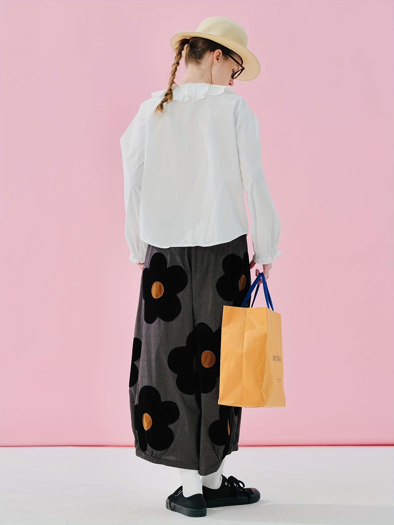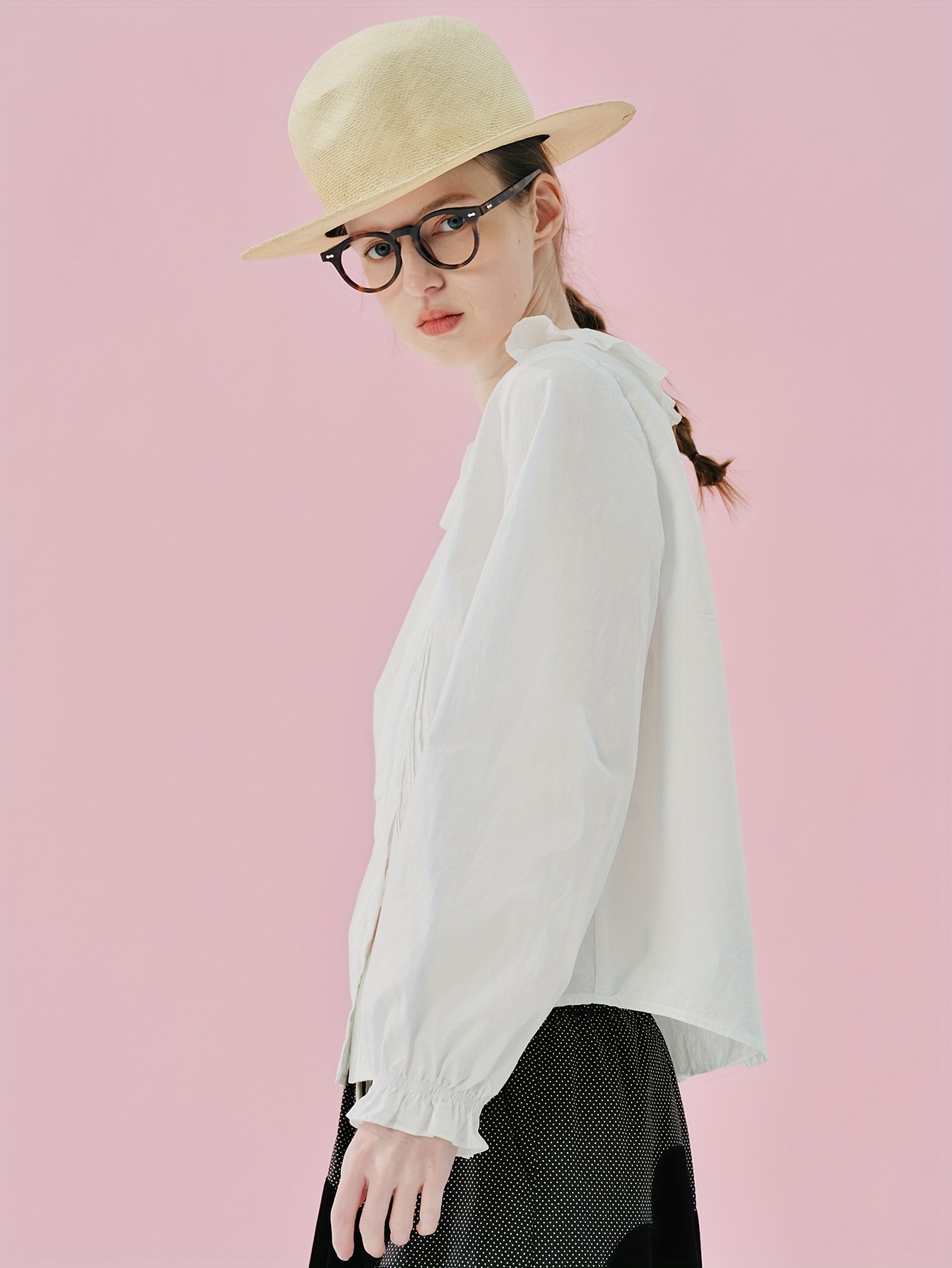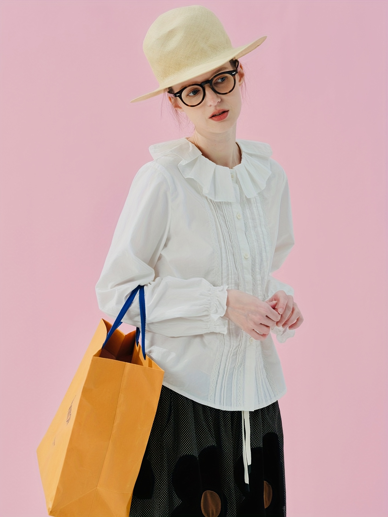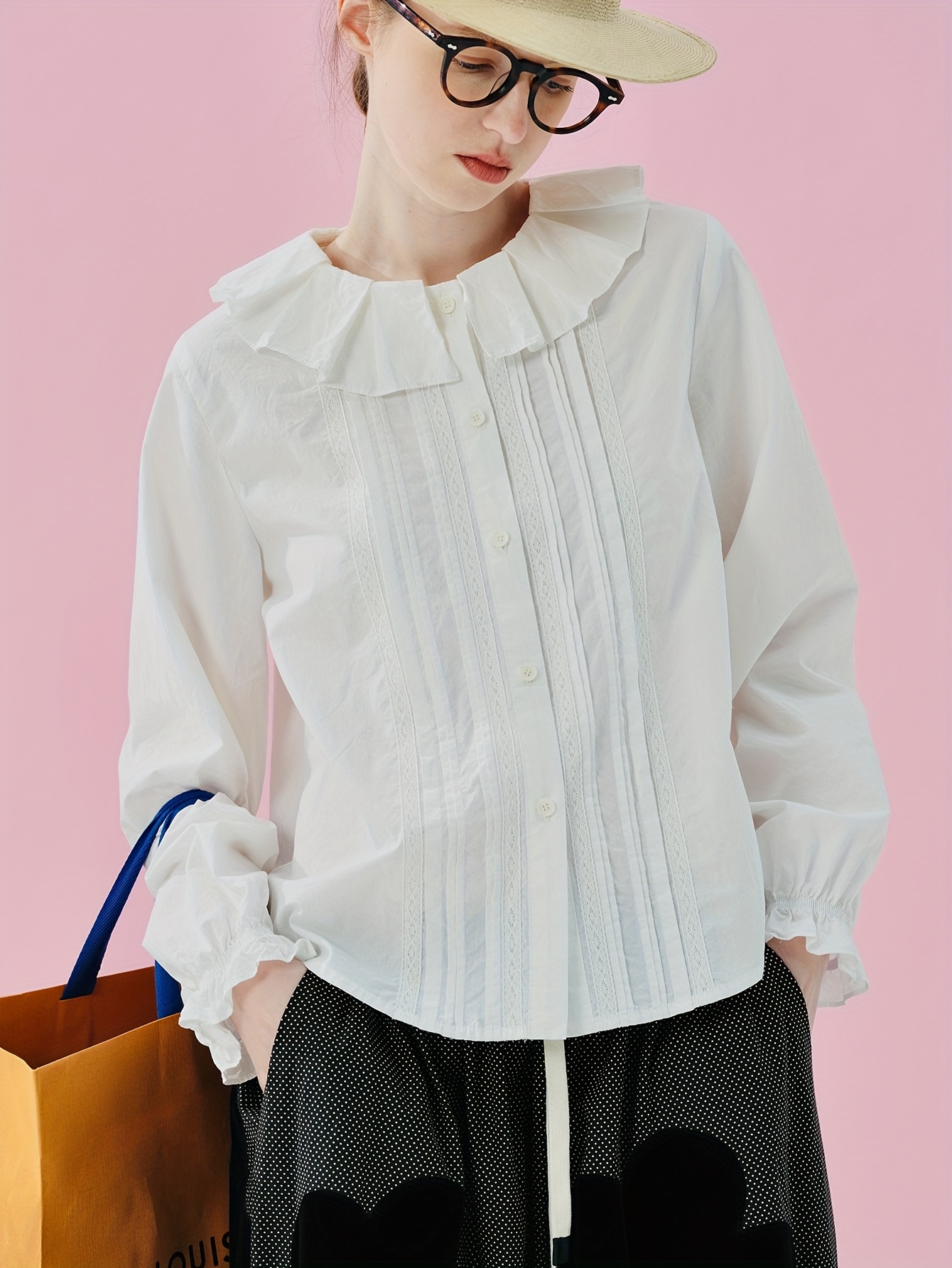 Women's Elegant Lace Trim Blouse - Long Sleeve Button-Front Shirt with Ruffled Collar