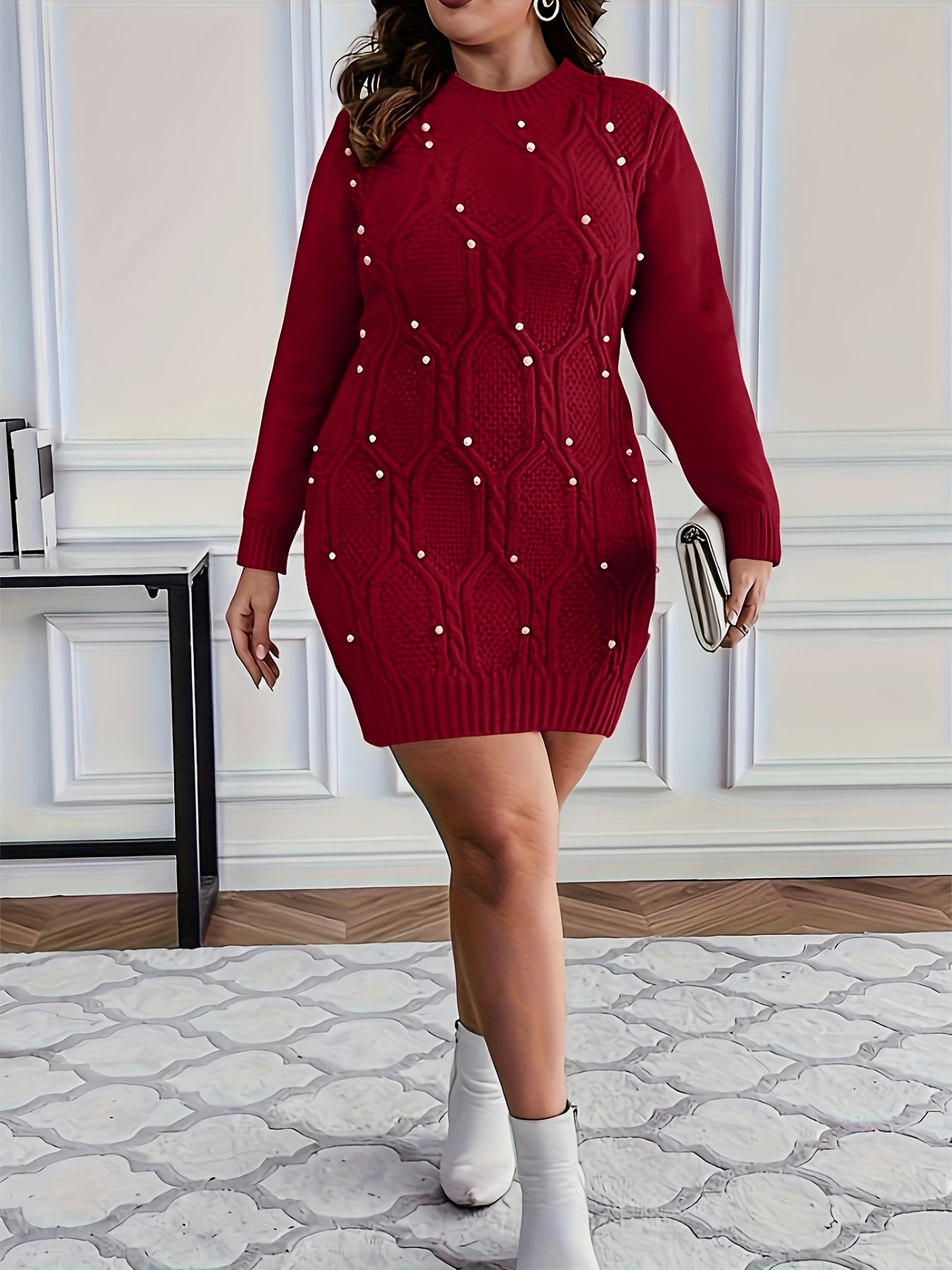 Women's Plus Size Burgundy Pearl-Adorned Oversized Sweater Dress Christmas Party New Year