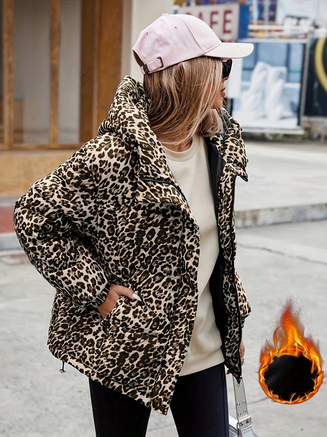 Women's Plus Size Winter Leopard Print Full-Length Zip Hooded Jacket